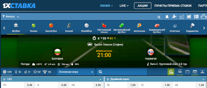 Пример. На матч Лиги Наций УЕФА Болгария – Норвегия 1x bet выставила такие коэффициенты: