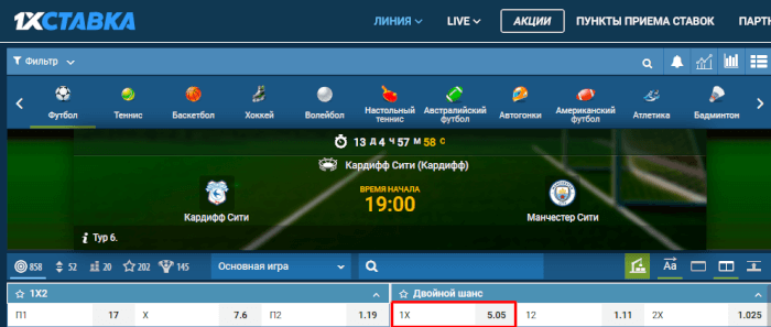 В этом случае фаворит очевиден, поэтому коэффициенты на двойные исходы, включающие победу фаворита (Х2 и12) очень низкие. Зато ставка 1Х может принести 405% выигрыша.