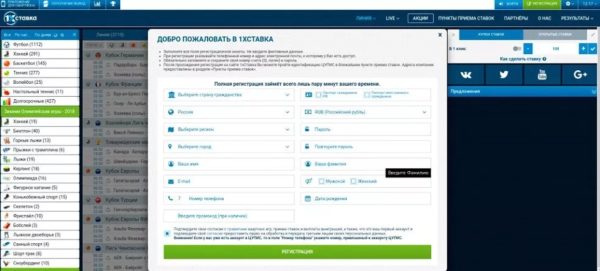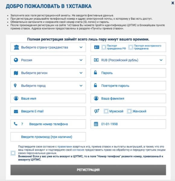 Как и многие другие букмекеры, БК 1хСтавка предлагает начать процесс регистрации с заполнения подробной анкеты пользователя. Нажатие на соответствующую кнопку в верхней части сайта открывает специальную форму. В ней следует указать следующие данные:
